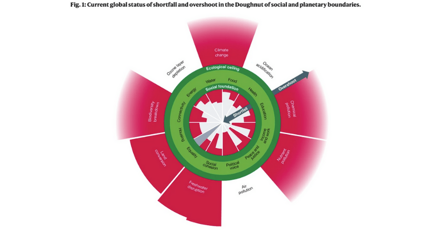 L’étude met à jour la représentation en donut de l’état social et écologique du monde. À l’intérieur du donut, les limites de douze minimas sociaux, à l’extérieur, les limites planétaires. Les conclusions de l’étude sont claires : « les politiques économiques qui donnent la priorité à une croissance économique sans fin n’ont pas réussi à amener l’humanité dans l’espace sûr et juste du donut ».